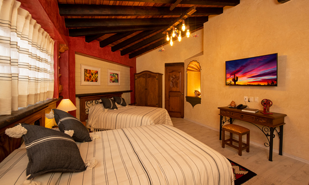 Such a spacious suite with Oaxacan decor and maximum comfort. Our suite is equipped with two double beds and private bathroom, perfect couples, with or without children. Our suites include Wi-Fi, air conditioning, smart TV, work desk, safe, telephone, room service and much more.